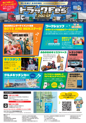そこで、愛知県トラック協会では、実は皆様の生活に密接に関係しているトラック運送業界を知っていただくための体験型イベントとして、今年で20回目を迎えるトラックフェスティバル(トラックFes 2026)を開催します。
